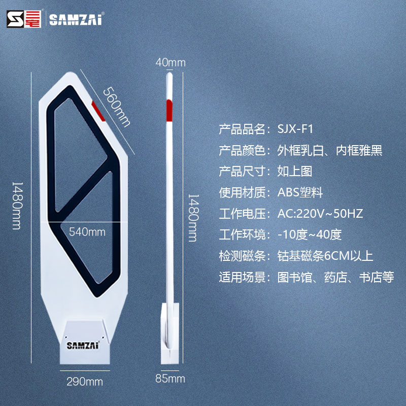 工作电压:AC220V 50Hz工作环境:-10~40ºC材料:高级树脂玻璃检测磁条长度:钴基磁条6cm以上检测高度:1700mm 监测宽度:800mm外形尺寸:1480*540*40mm