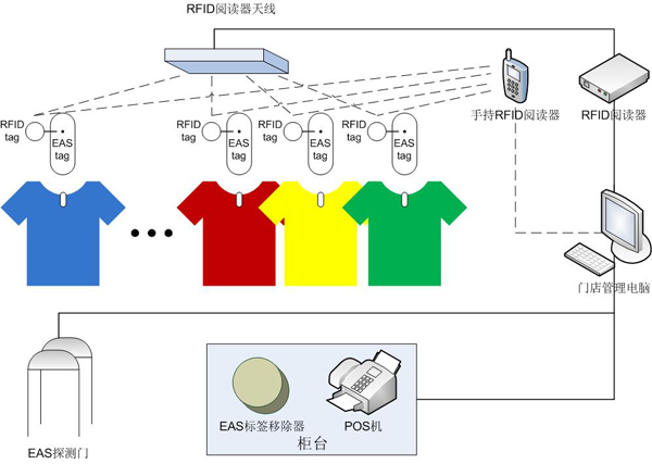 防偷盗管理:在服装商品上附加用RFID技术的EAS,如果窃贼同时偷盗了多件商品,系统会一目了然地知道窃贼偷盗了多少服装和是什么服装。使用