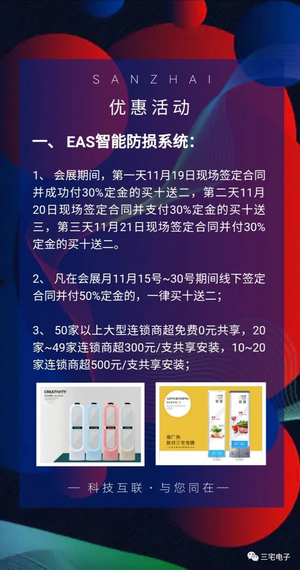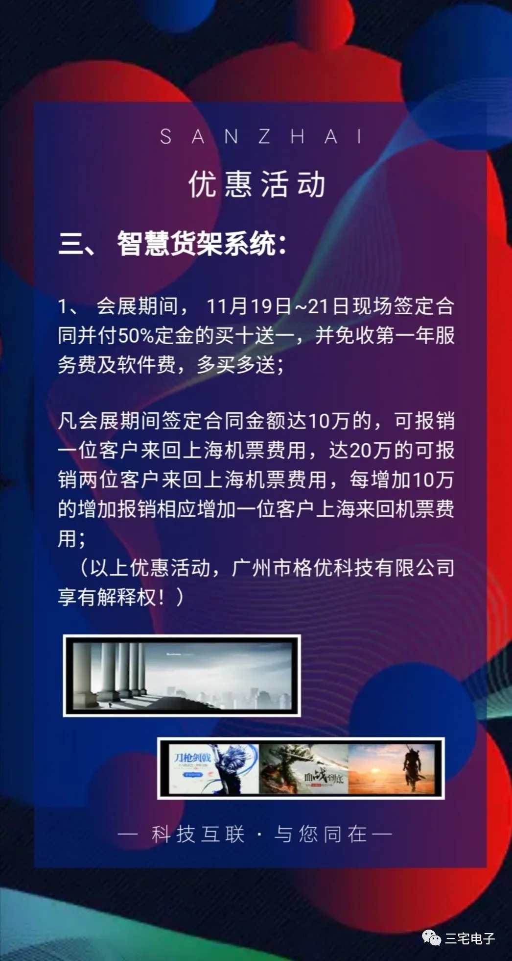 格优科技作为电子零售行业内领先的智能防损管理系统服务商,服务了众多知名连锁商超企业,同时也服务了众多零售商超店家。以同行业内品类款式全、效果强、产品使用寿命周期长、售后维护快等,在行业内拥有较高的知名度与美誉度。从2004年成立,始终以“化繁为简、强大易用”作为产品研发、业务拓展及服务的核心理念,至2019年格优云新零售,畅销全球20多个国家,成为国内领先的零售设备产品一站式服务,专业电子设备及软件开发的高科技公司。公司自主研发的“米亚可“系列的ESL电子价格管理及RFID智慧门店管理系统,以及“三宅”系列的EAS防损设备凭借高精、稳定性好、科技含量高的特点,和优雅大气的外观赢得了国内外零售企业、商家的认可。在展会月期间为回馈新老用户,补贴商家疫情期间的损失,格优科技真情回馈!第一天与最后一天签定合同并付定金30%,买10送2!第二天签定合同并付定金30%,买10送3!没参加会展的也不要失望,在会展月11月15~30号期间,在线下签定合同并付定金50%,同样享受买10送2的钜惠活动!在会展月11月19~30号期间,在线下签定合同并付定金50%,享受买10送1且免收第一年服务费及软件费,多买多送!